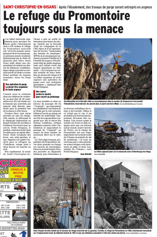 Je pars maintenant retrouver deux géologues pour rejoindre le refuge du Promontoire. Ils vont réaliser l'évaluation la plus précise possible des purges nécessaires et envisager la pose de capteurs pour mieux comprendre d'éventuels mouvements de la roche. Les travaux de purge devraient se dérouler dans les jours qui suivent. Et viendra après, l'état des lieux du refuge et les travaux sur le bâtiment.