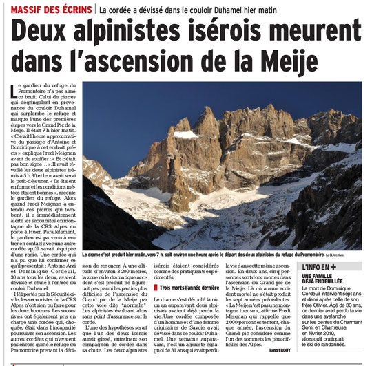 Suite aux problèmes rencontrées par une cordée d'alpiniste de 70 et 72 ans (dans la nuit de mardi à mercredi) en redescendant du Doigt de Dieu en fin de Traversée de la Meije (voir le "En Direct" d'hier), le Dauphiné Libéré de ce matin y consacre un article.