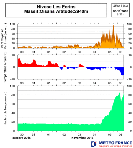 Les scénarios les plus pessimistes annoncent jusqu'à 20 à 30 cm (?) de neige à 3500m cette nuit. Pour tous ceux qui ont réservé pour ce weekend, nous publierons ici nos relevés et observations demain matin tôt.