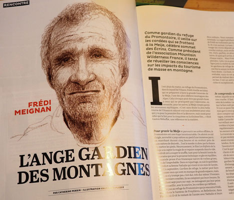 Le magazine "TERRE SAUVAGE" daté de janvier 2018 publie mon "portrait" en tant que gardien du refuge du Promontoire et également président de Mountain Wilderness. Merci à Catherine Perrin (rédactrice en Chef adjointe) pour cet article, il me semble, bien fidèle ! Il est toujours difficile d'en extraire seulement quelques mots, mais voilà ceux-ci à propos de notre métier de gardien de refuge en haute montagne: "... on est porté par une énergie folle qui nous permet de réaliser des choses qu'on serait incapables de faire en bas. C'est un autre monde, ce qu'on y vit est tellement riche et exceptionnel, on donne tout...".
