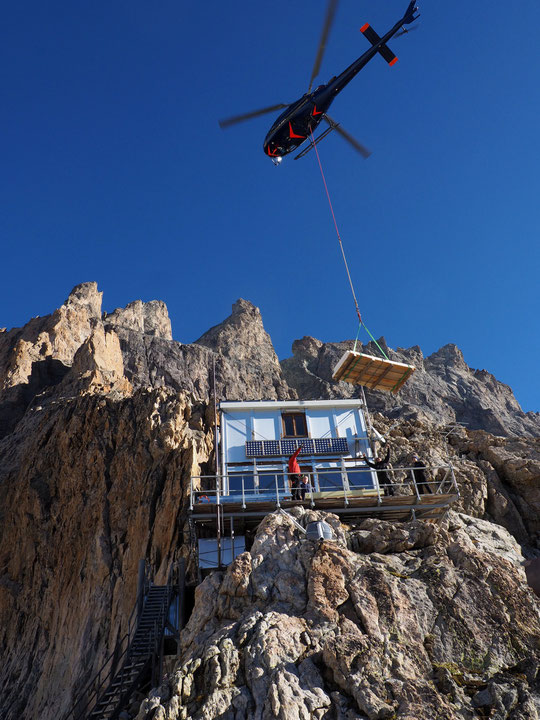 Le refuge, lui, n'a pas bougé...(ouf !). L'arrivée d'eau des cuves est gelée. Nous allons faire fondre un peu de neige pour préparer le repas. A peine arrivés, avec Marion (aide gardienne) et l'équipe nous avons réceptionné et positionné tout le matériel à chaque rotation d'hélico. Dans une ambiance bien fraîche tout est maintenant installé, les travaux démarrent tout de suite...