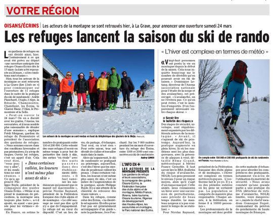 Nous allons bientôt rentrer dans les préparatifs de l'ouverture de la saison de ski de rando en Oisans (17 mars). Une saison qui pour nous va démarrer dès le 8 mars à la Grave par une réunion pour l'ouverture des refugs de l'Oisans, le 14 mars à la Bérarde pour l'héliportage, dès fin février pour la préparation du matériel et de l'approvisionnement et dès maintenant pour les réservations. On commence à se remettre dans l'ambiance... Super !