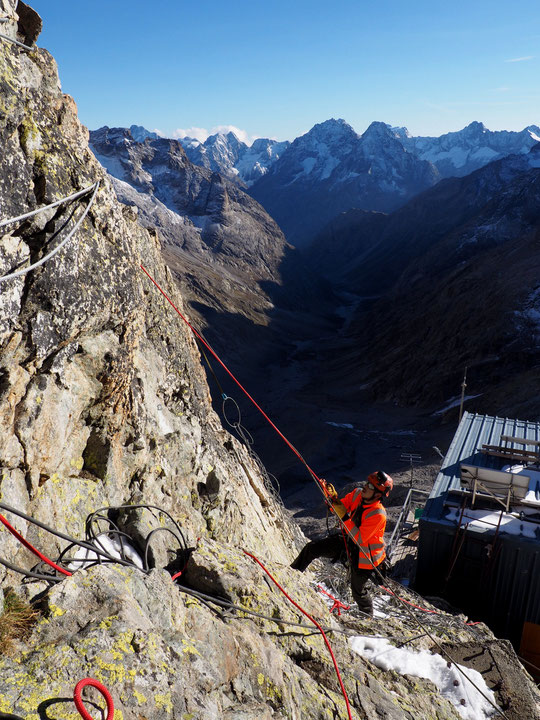 30 septembre, la sécurisation et les purges de plusieurs dizaines de mètres cubes de roche sur la "bosse" située 20m au dessus du refuge sont officiellement terminées ! Un grand bravo et merci à tous !