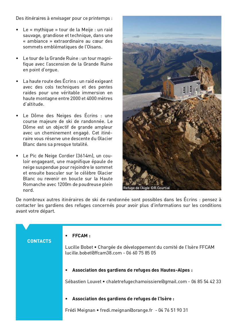 Tous les autres gardiens Oisans/Écrins ouvriront en même temps le 17 mars avec des héliportages prévus le 15 mars.