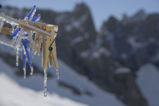 Tard hier soir une cordée est arrivée du "Z" en face Nord : Ils ont mis 9 h pour tracer la montée. Encore beaucoup de neige récente, ça brasse avec de réelles difficultées pour placer des protections. Redescente dans le brouillard vers le Promontoire, leurs affaires détrempées séchent ce matin sur la terrasse du refuge.