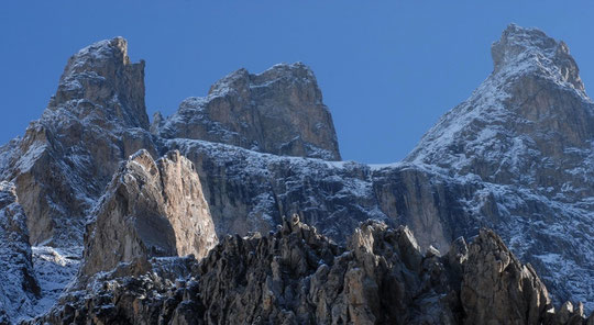 il fait 1,5°, le soleil est déjà bien présent sur les sommets. Hier il est tombé 14mm d'eau avec une limite pluie neige au dessus de 3500m. Cette journée de dimanche annonce le retour de la chaleur. Les parois devraient sécher assez rapidement. Nous remontons ce matin au refuge, avec les enfants, rejoindre Guillaume, notre stagiaire.