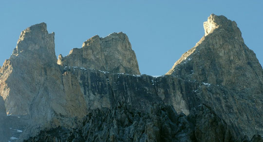 A 3h, sept cordées (Françaises, Allemandes et Autrichiennes) se sont lancées dans la Traversée de la Meije. A 3h30, quatre cordées dans la "Pierre Allain" et une cordée dans "Mitchka". A 4h, deux cordées sont parties vers le sommet Est du Râteau. A 7h cinq randonneurs ont observés, avec nos jumelles, les "petits bonshommes" tout là haut dans l'immense paroi... A 8h une cordée (de 2 guides) va monter grimper "Tout est bon dans le Nichon" une belle "petite" voie de 250m bien soutenue (6c max) en très bon rocher. Demain ils iront dans "Mitchka".