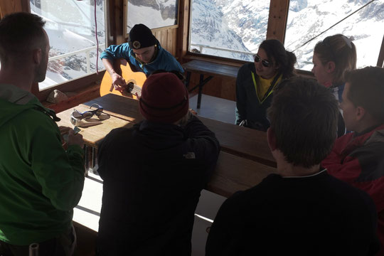 Au vu de la chaleur annoncée (iso à 4000m) pour notre dernière journée de ski de rando de la saison, nous avons avancé encore le réveil matinal. Il vient de sonner (à 4h) pour nos 8 passagers qui