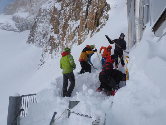 Les prévisions des ingénieurs Météo France étaient précises (merci): hier matin nous avons eu un bon créneau de 4h bien dégagé avec à l'arrivée 50cm de neige fraîche tombés dans la nuit. L'héliportage a été "chaud" ; il a fallut faire très vite pour dégager les portes enfouies sous la neige et préparer une plate forme de dépose des charges... les pelles et les bras ont chauffé sévère. Un très grand merci aux amis montés à dix (Merci Louchka, Jéremy, Jean Philippe, Mathis, Pauline, Noé, Théophile, Erick, Vianney). Encore merci pour les mètres et les mètres cubes déplacés. Une situation et un travail impressionnant. Dans un décor, une ambiance de rêve, nos hautes montagnes sont magnifiques !