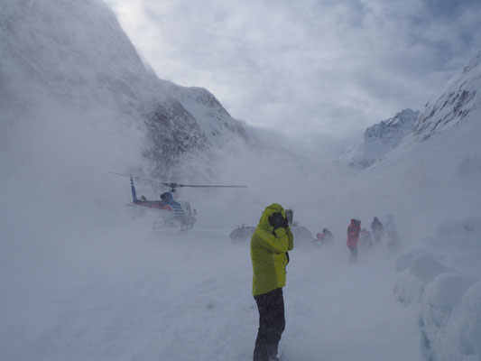 Toute la journée d'hier nous étions 10 à attendre coté la Bérarde et autant coté du Col du Lautaret pour les héliportages du Promontoire, de l'Aigle et de Planchard. Tous, équipés pour monter et tenter de déblayer les abords de nos refuges... mais les éléments ont eu le dessus. Décidément nous sommes vraiment petits en haute montagne ! En arrivant hier matin il neigeait puis le brouillard a joué au yo-yo laissant même apparaître des lueurs de soleil couleur espoir... mais jamais assez pour que l'hélico puisse passer. Nous avons attendu jusqu'en fin de journée avec tous nos" bags" chargés chacun de 650 kg, prêts pour le décollage. A partir de 16h le ciel a commencé à s'éclaircir... grâce à un fort vent qui a fait fumer la montagne de sa neige fraîche. Mais à plus de 80 km/h à 3000m ce vent, non annoncé, nous a interdit toute tentative d’accéder à nos refuges... Alors sur la DZ nous avons rangé nos 2400 kg de matériel et nous sommes aller boire une bonne bière locale au camping de Venosc (merci !).