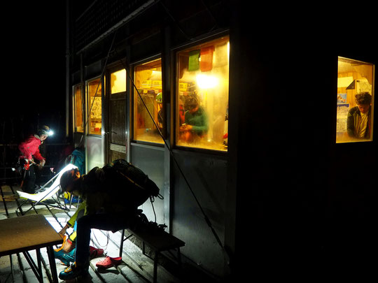 il fait moins 5° avec un grand ciel bleu et des sommets justes ensoleillés. La nuit fût magnifique et lumineuse entre pleine lune et montagne enneigée. La petite sortie vers 2h du mat sur la terrasse était simplement... féerique. Des coups de vent ont un peu réveillé notre équipe montée pour la préparation du refuge. Ça fait du bien de retrouver la haute montagne et les éléments naturels, grandioses...