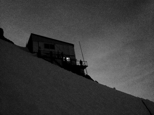 Infos que nous avons des gardiens restés là haut : depuis le lever du jour, le ciel est bâché avec quelques flocons. Et le vent de sud se renforce à l'avant de la perturbation annoncée à partir de ce soir...