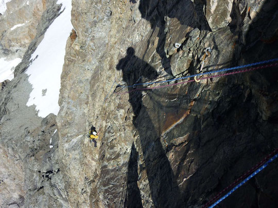 Record d'affluence pour le "Z" avec 12 alpinistes engagés dans ce bel itinéraire de la Face Nord. En bonnes conditions, nous avons observé les premiers qui sortaient à 11h au sommet du Doigt de Dieu !