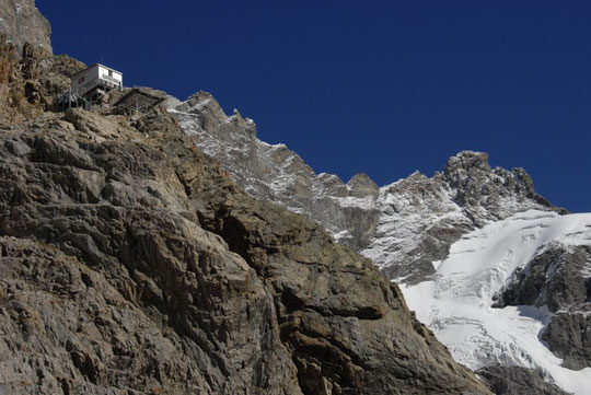 De là, un sentier remonte le vallon des Étançons et franchit les moraines. Vers 2900m, deux possibilités : soit traverser à gauche vers l'Est puis virer à droite en remontant sous le glacier pour rejoindre le refuge (nombreux cairns). Soit grimper droit sur l'arête du Promontoire. L'arête est équipée d'un câble type via-ferrata (s'équiper en conséquence).